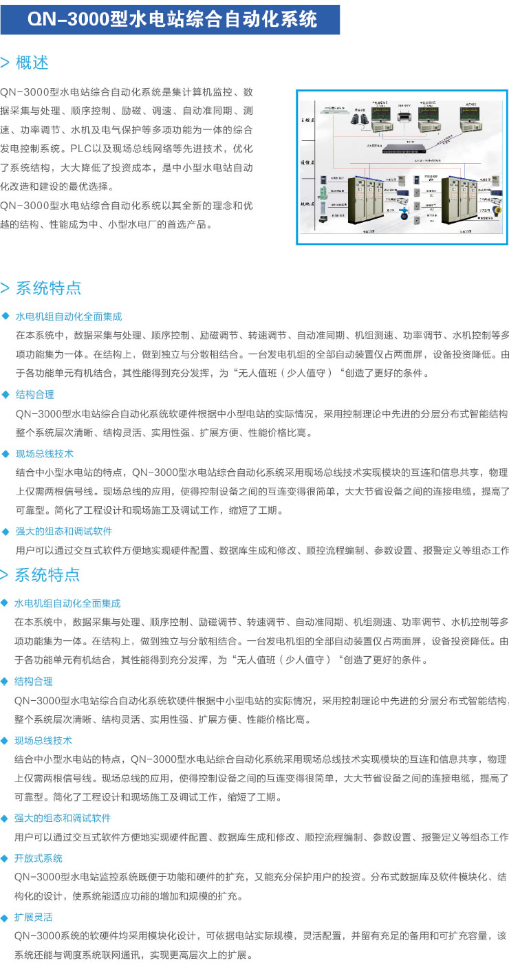 QN-3000型水電站綜合自動(dòng)化系統(tǒng)是集計(jì)算機(jī)監(jiān)控、數(shù)據(jù)采集與處理、順序控制、勵(lì)磁、調(diào)速、自動(dòng)準(zhǔn) 同期、測(cè)速、功率調(diào)節(jié)、水機(jī)及電氣保護(hù)等多項(xiàng)功能為一體的綜合發(fā)電控制系統(tǒng)。PLC以及現(xiàn)場(chǎng)總線(xiàn)網(wǎng) 絡(luò)等先進(jìn)技術(shù),優(yōu)化了系統(tǒng)結(jié)構(gòu),大大降低了投資成本,是中小型水電站自動(dòng)化改造和建設(shè)的最優(yōu)選 擇。